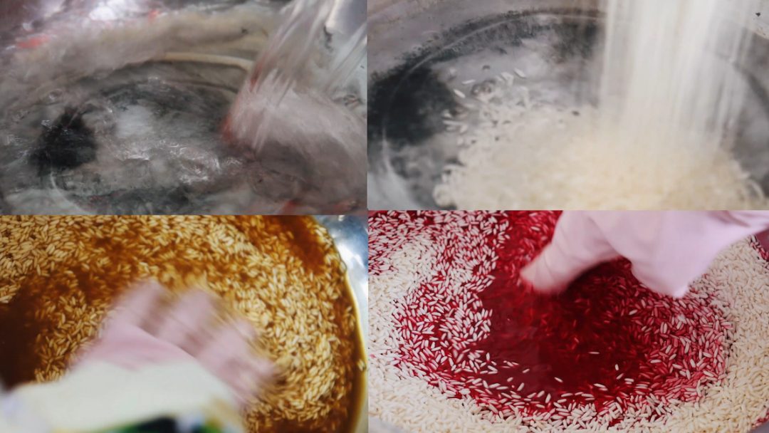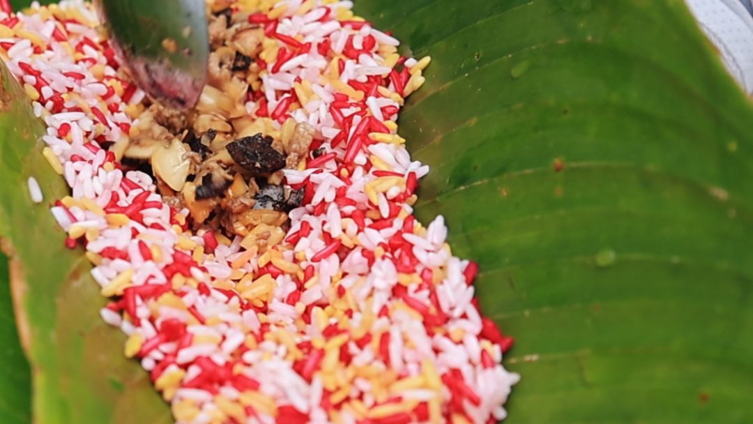 这道承载着民族风味的佳肴源于天然草木的馈赠。糯米浸入草木染汁,浸泡一小时,充分汲取自然精华后化作嫣红、鹅黄的彩糯,透着莹润光泽。