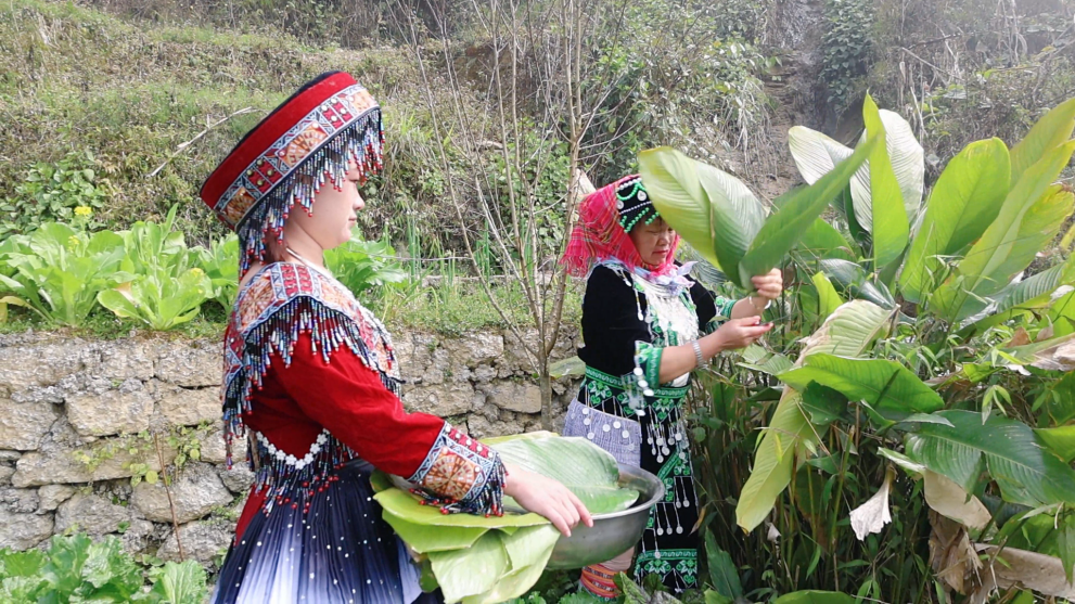麻栗坡县麻栗镇潘家坝村委会大石庄村小组,晨雾轻笼,烟火袅袅,苗族群众王金花正带着儿媳张丽,制作苗家特色美食——彩糯粑粑。