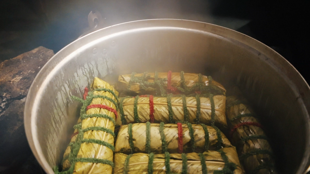 一个个圆润饱满的彩糯粑粑入锅慢煮,在柴火的加持下,粽叶的清新、馅料的醇香与糯米的甜润层层交融,香气四溢。
