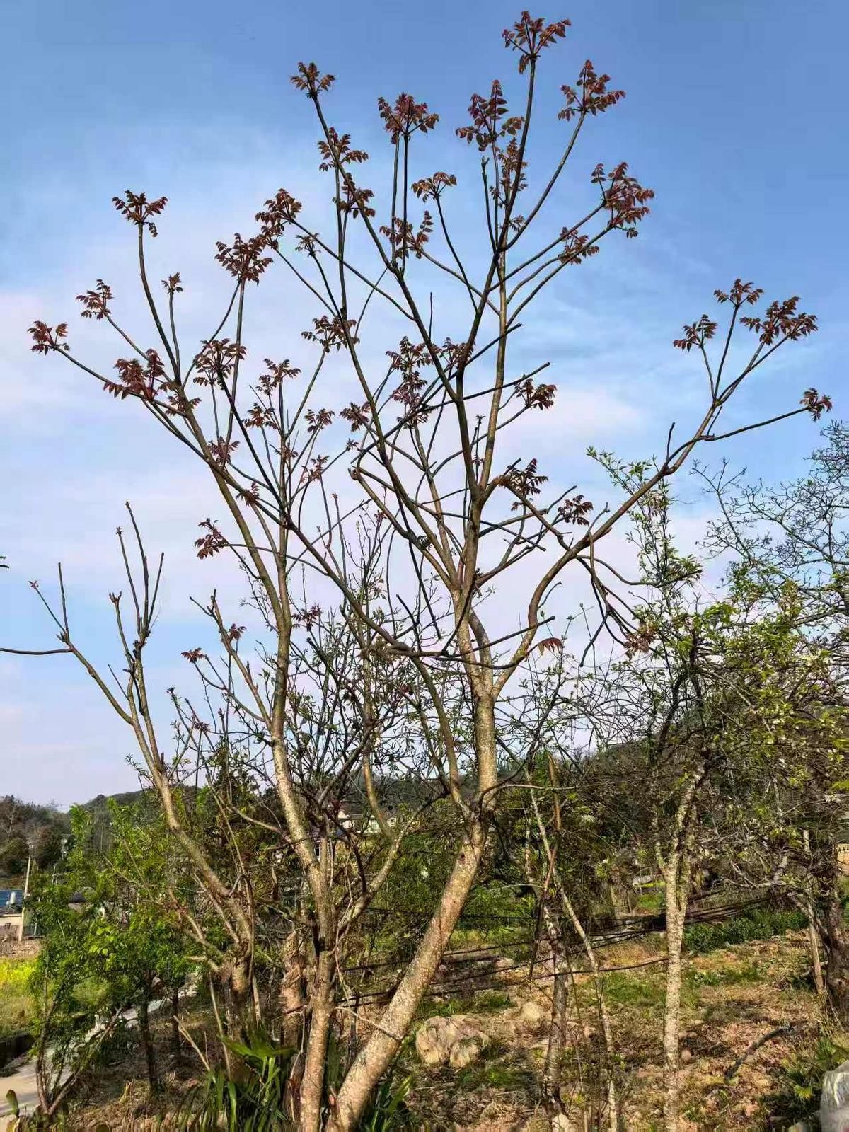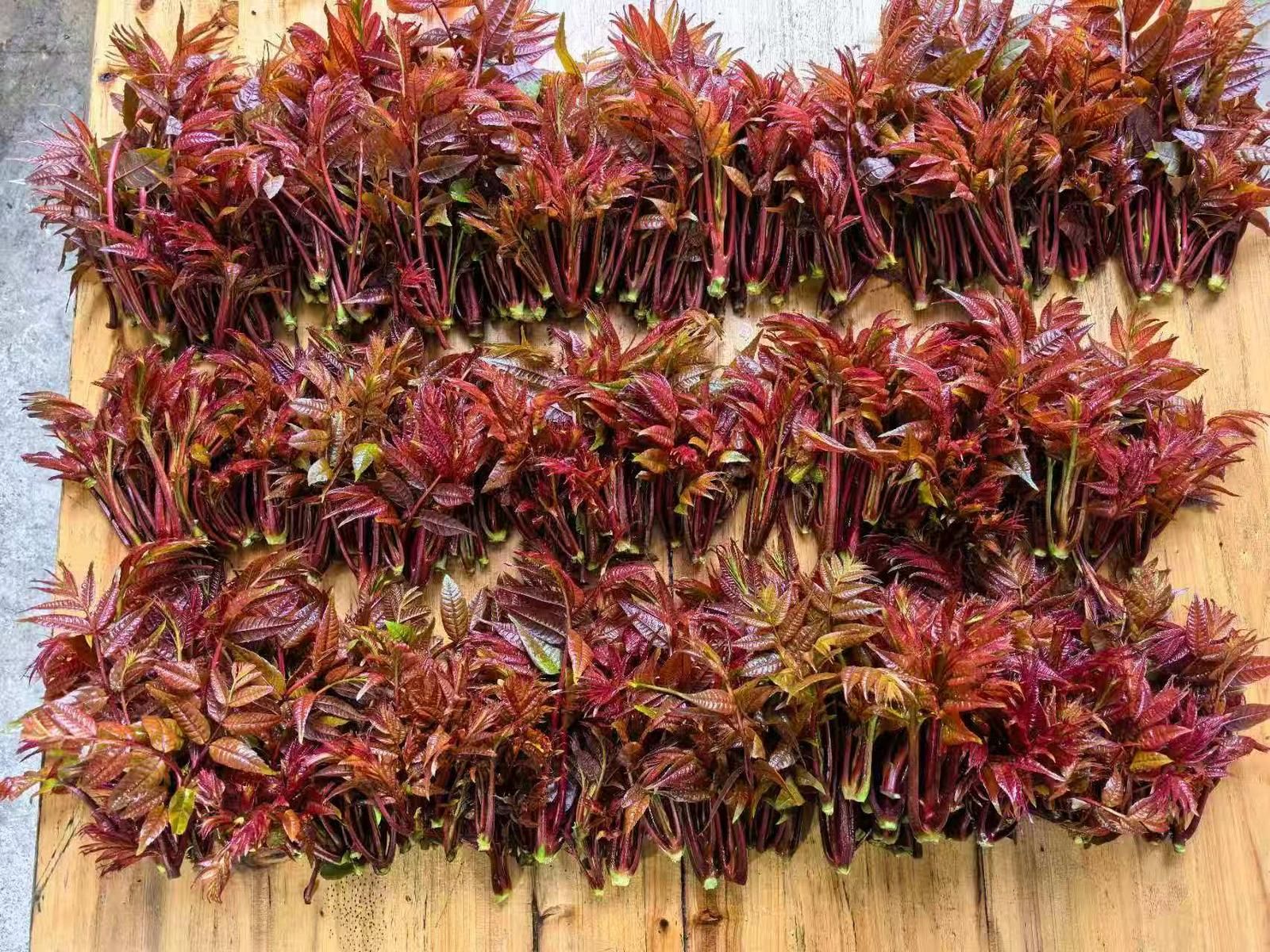 在海拔近两千米的山地上,香椿树沐浴云雾,蓬勃生长,嫩红的椿芽红中透紫,宛若翡翠般晶莹剔透。中寨村种植的香椿并非寻常品种,而是精选的四季红油香椿。