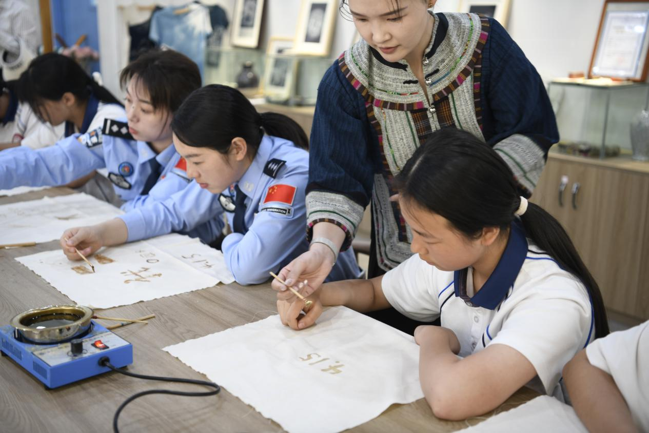 在专业教师的悉心指教下,师生和民警代表们围坐案前,凝神聚力投入创作。化蜡、点染、勾勒,一道道传统工序有条不紊,同学们以蜡为墨、以布为卷,将对家国平安的祝愿、对文化安全的守护,细细描摹在方寸布料之上。政治安全、文化安全等总体国家安全观核心内容,经同学们的巧手转化为独具民族特色的图案,每一笔勾勒都饱含赤诚,每一次浸染都承载担当,生动展现了边疆青少年心系家国、守护安全的青春风采。